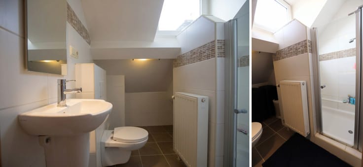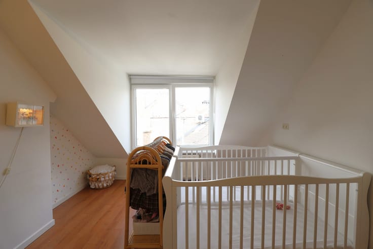 2e étage : 2 grandes chambres (15 et 13 m2), pièce débarras, salle de douche et wc