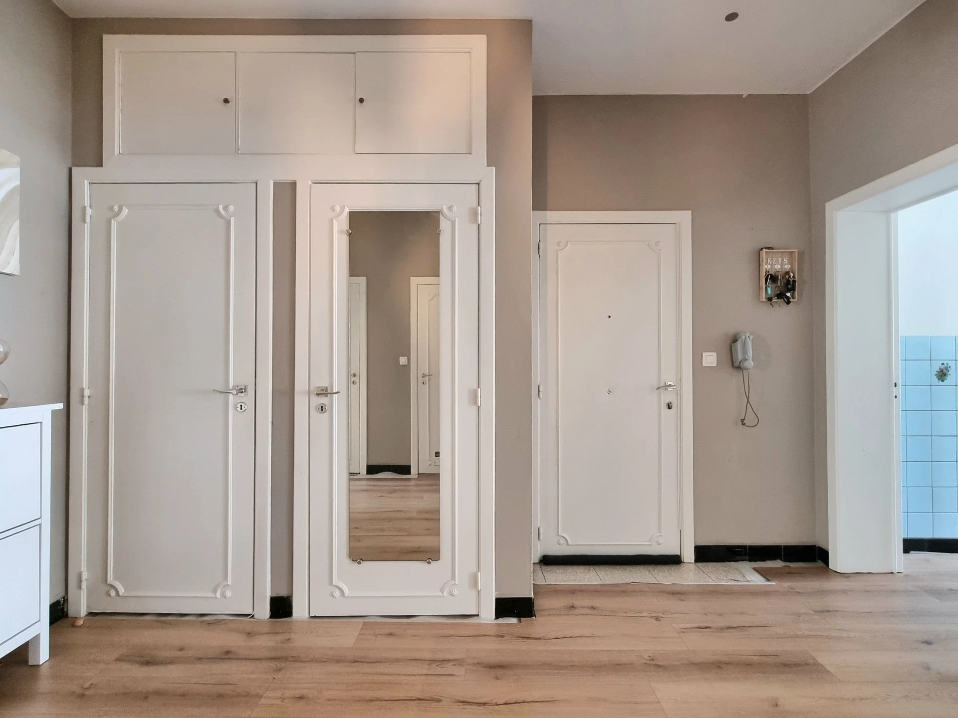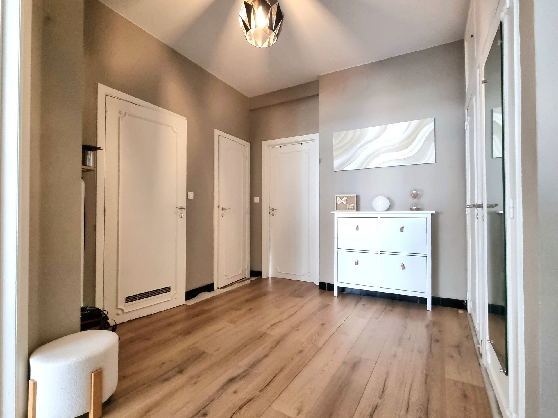 Le parquet stratifié flottant sera retiré par le locataire : parquet à bâton rompu dans le séjour et carrelage dans la cuisine et le hall